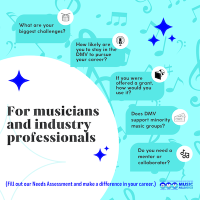 We look to our music community to express their goals, needs, and challenges. Through our Needs Assessment Survey and other programs, we are able to hear firsthand from the people we are trying to help. Please fill out our easy questionnaire, so that we may help you reach your professional goals right here in the DMV. Go to this page now.